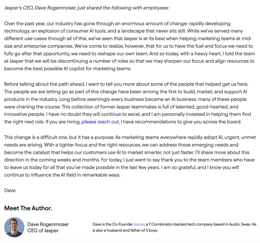 ▲Jasper CEO戴夫·罗根莫瑟(Dave Rogenmoser)7月12日在公司官方发布的裁员公告