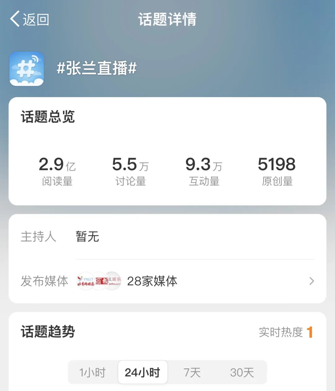一系列操作下来,#张兰直播 很快被送上微博热搜,其抖音直播间也一度冲上抖音直播带货榜第一。根据第三方数据,这场直播的观看人次突破了3000W,人气峰值达到22.2W,直播销售额预估在1000W-2500W左右。