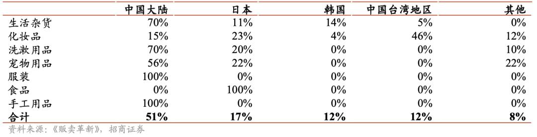 他们的门店面积一般为街边大型门店面积约1500平米,购物中心内商店约500平米。品类以食品、日用品、化妆品、五金、装饰品等小商品为主;SKU在7万左右,每月上新800种左右。