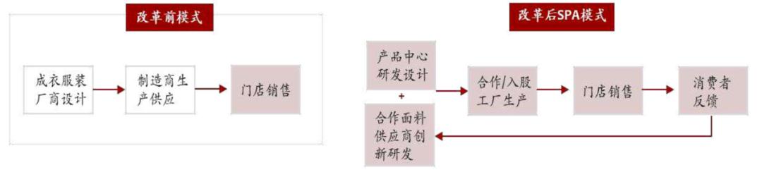 2000年起,公司引入GAP创立的SPA模式(自有品牌服装专营模式):即消除供应链中介角色,直连生产与销售、独立掌控商品物流资金流信息流通的商业模式,解决了传统服装零售供应链牛鞭效应导致的生产质量管控不足、流通效率低下、层层加价、库存积压等问题。