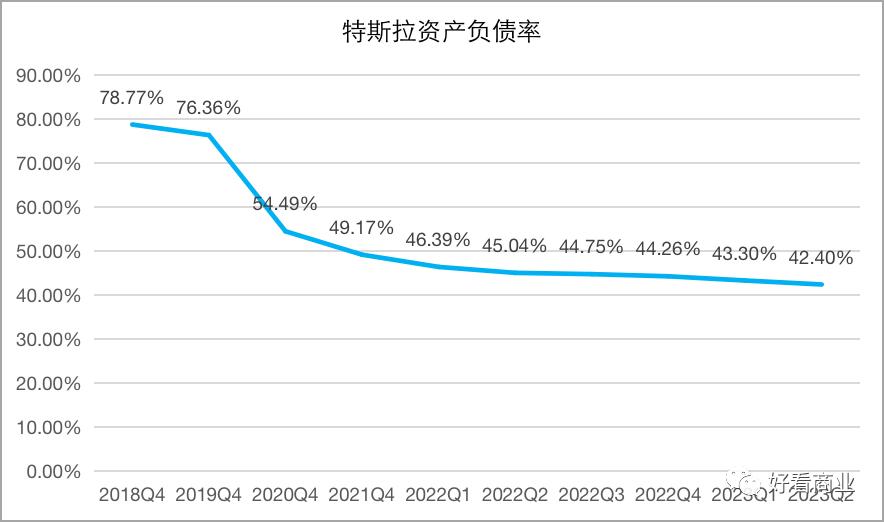 几年来,特斯拉一直在努力以更低的资产负债率实现发展。2023年Q2,特斯拉的资产负债率降至42.4%,一年内到期债务降至 99 亿美元。而2018年末,特斯拉资产负债率达到78.77%。