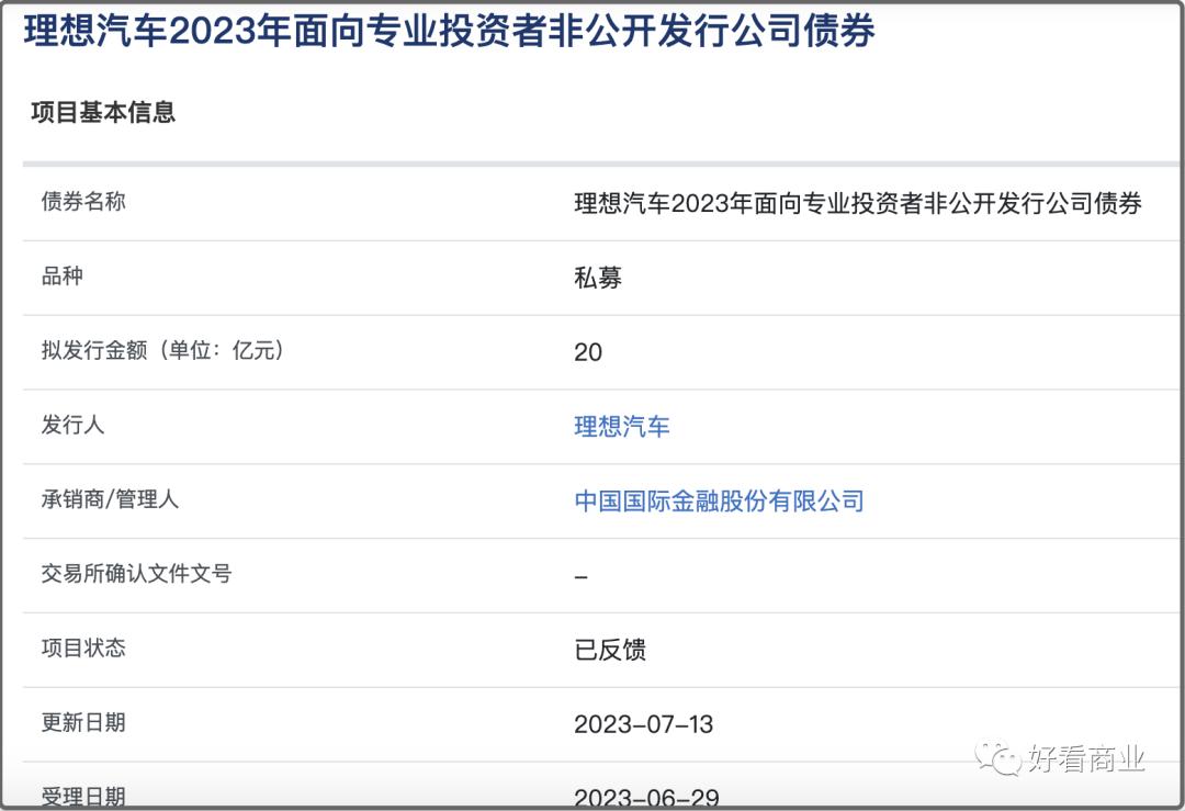 据上海证券交易所公司债券项目信息平台显示,理想汽车2023年拟面向专业投资者非公开发行公司债券20亿元。品种为私募,承销商/管理人为中国国际金融股份有限公司。