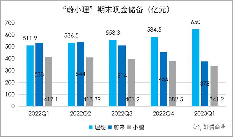 就现金储备来说,截至今年一季度末,蔚小理的现金储备分别为:378亿、341.2亿和650亿元。