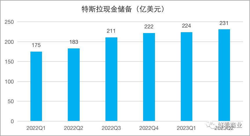 从财报看,去年Q1以来,特斯拉现金储备(包括现金及现金等价物、投资)持续增加。截至今年一季度末,达到231亿美元。