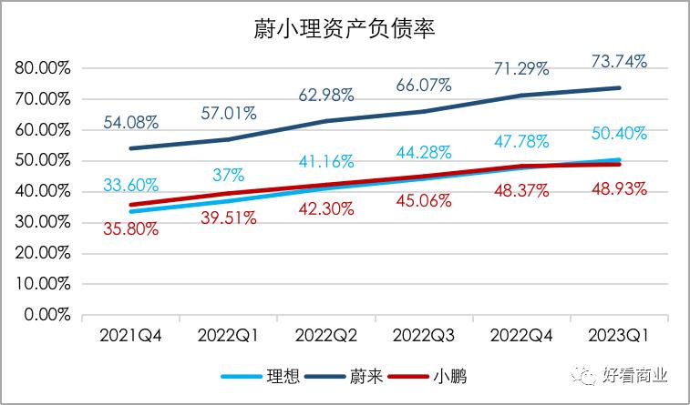 蔚来资产负债率明显高于理想与小鹏,后两者的资产负债率虽然也在不断攀升,但基本控制在50%以内。
