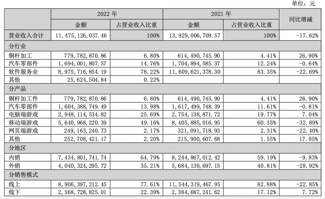 至此,世纪华通实现了网络游戏业务类型全覆盖,游戏业务成为公司发展主要驱动力,公司来自游戏收入的占比一度达到80%以上。2022年度,世纪华通来自自主运营游戏收入79.88 亿元,占主营业务收入的 70.92%。