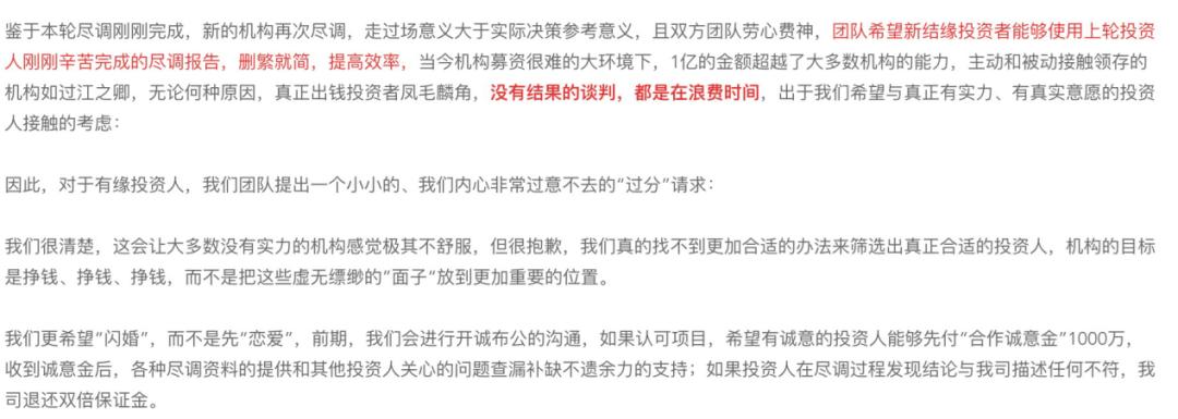 不过官网声明还是在末尾加了句“如果投资人在尽调过程发现结论与我司描述任何不符,我司退还双倍保证金”,强调了公司的信息诚信,却暂未明说如果机构尽调完没“闪婚”,1000万“彩礼”该如何处置。
