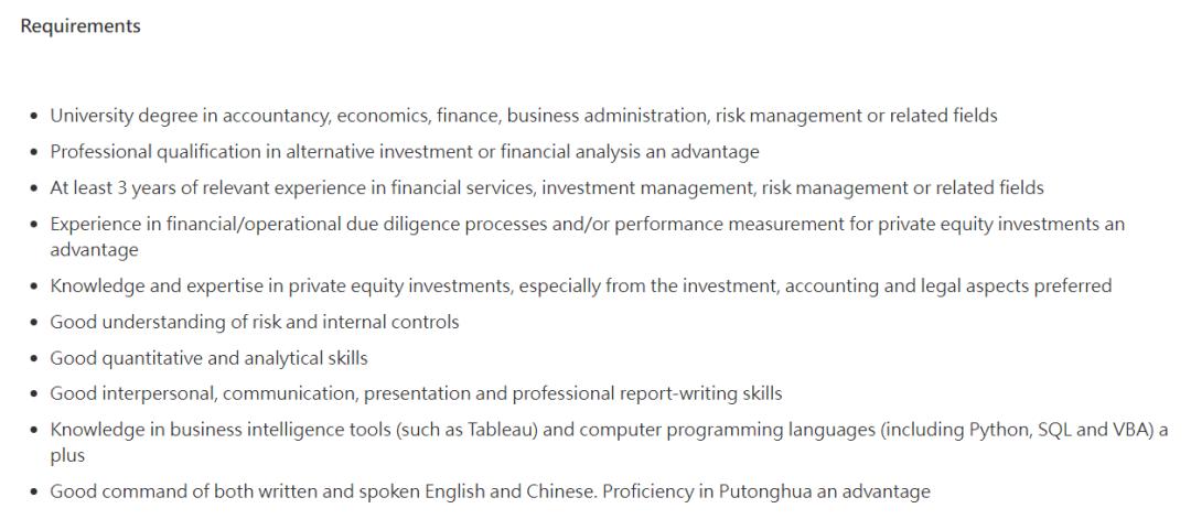 在业务要求上,至少有3年金融服务、投资管理、风险管理或相关领域的相关经验,其中有私募股权投资财务/运营尽职调查流程和/或业绩衡量经验者优先;