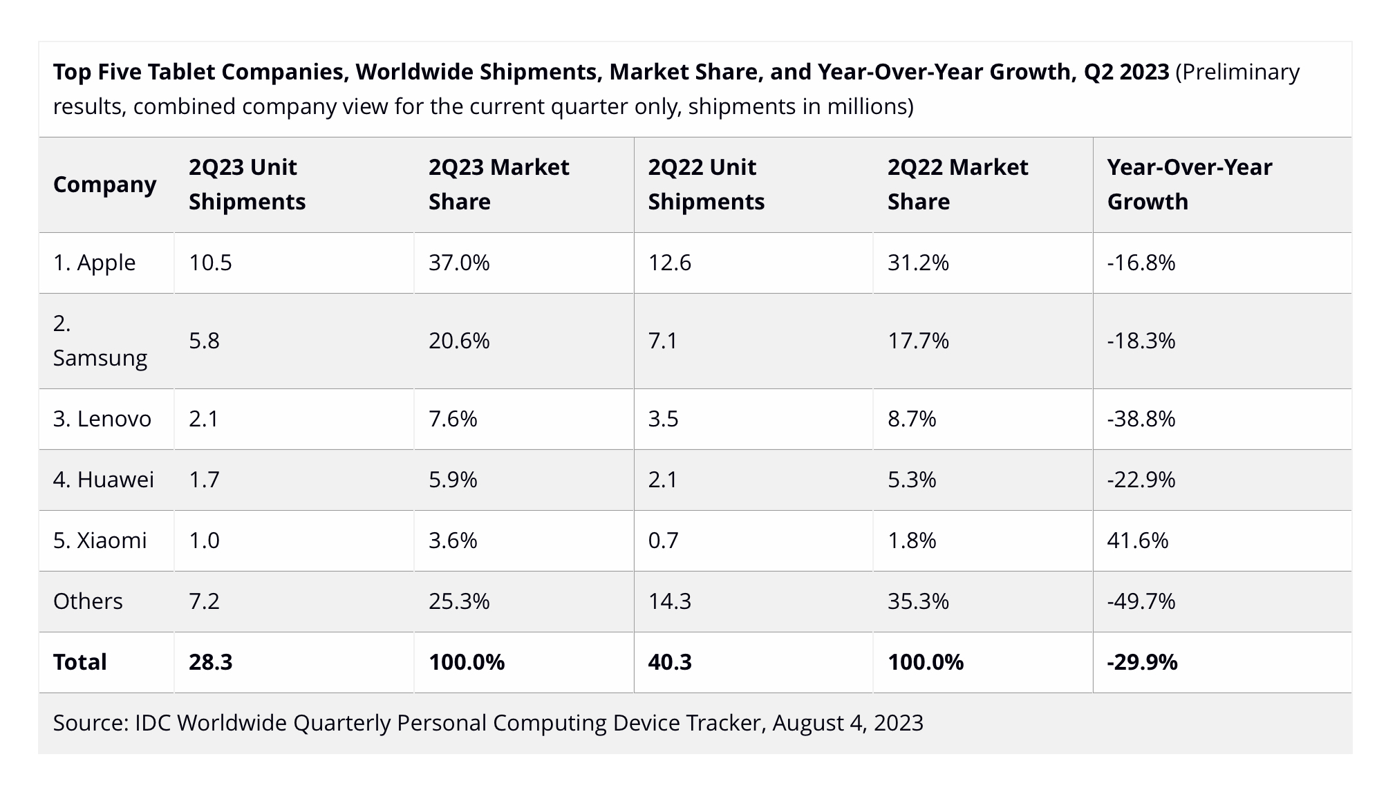 2023年8月4日,IDC公布了2023年第二季度平板电脑出货量追踪的初步统计数据:2023年第二季度全球平板电脑出货量共计2830万台,同比下降了29.9%。统计中出货量排名前五的企业依次为Apple、三星、联想、华为和小米,其中除了小米凭借100万台的出货量获得同比41.6%增长外,其余四大品牌均出现了同比倒退的情况。