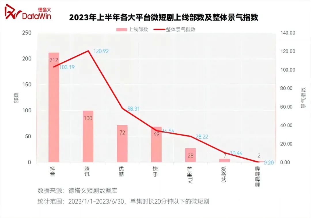 德塔文报告显示,今年上半年,国内共上新微短剧481部,爱优腾占了179部。这179部里,超过半数都来自腾讯视频,而爱奇艺的短剧仅上新7部。短视频那边,抖快共上线了280部短剧。抖音一家的数量就超过了主流长视频之和。