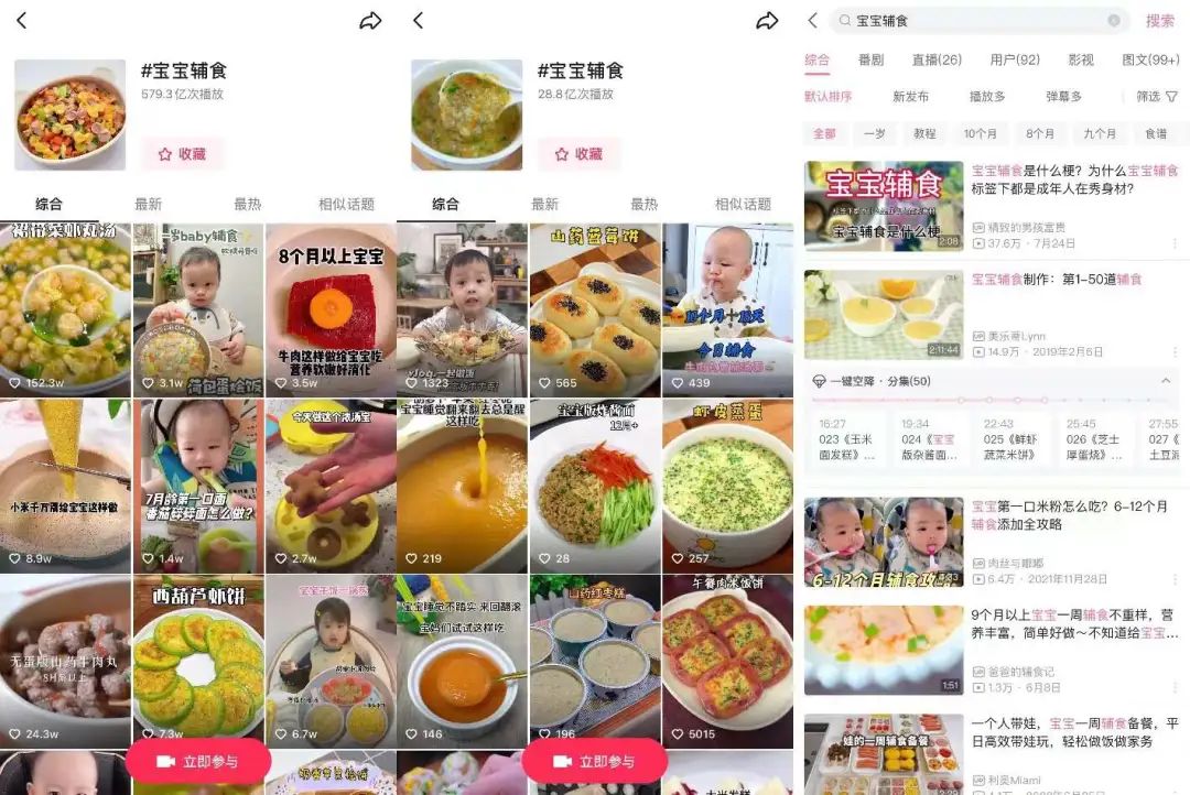 而在抖音、B站、快手等其他内容平台上搜索“宝宝辅食”,相关话题累计播放量已经超过百亿次,主角是真正的宝宝与辅食。