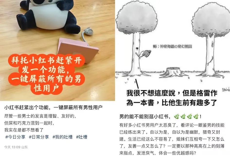 所以有女性用户直接表态希望“男的能不能别逛小红书”,或是喊话平台出个新功能,能够“一键屏蔽所有男性用户”。