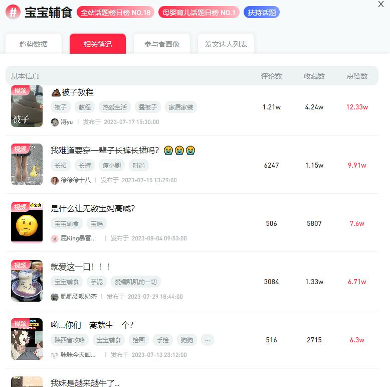 从新红数据的统计来看,近一个月内#宝宝辅食#标签内容中,点赞数最高的前10条有8条与真正的宝宝辅食毫无关系,而是穿搭、爱好、科普教育等话题。