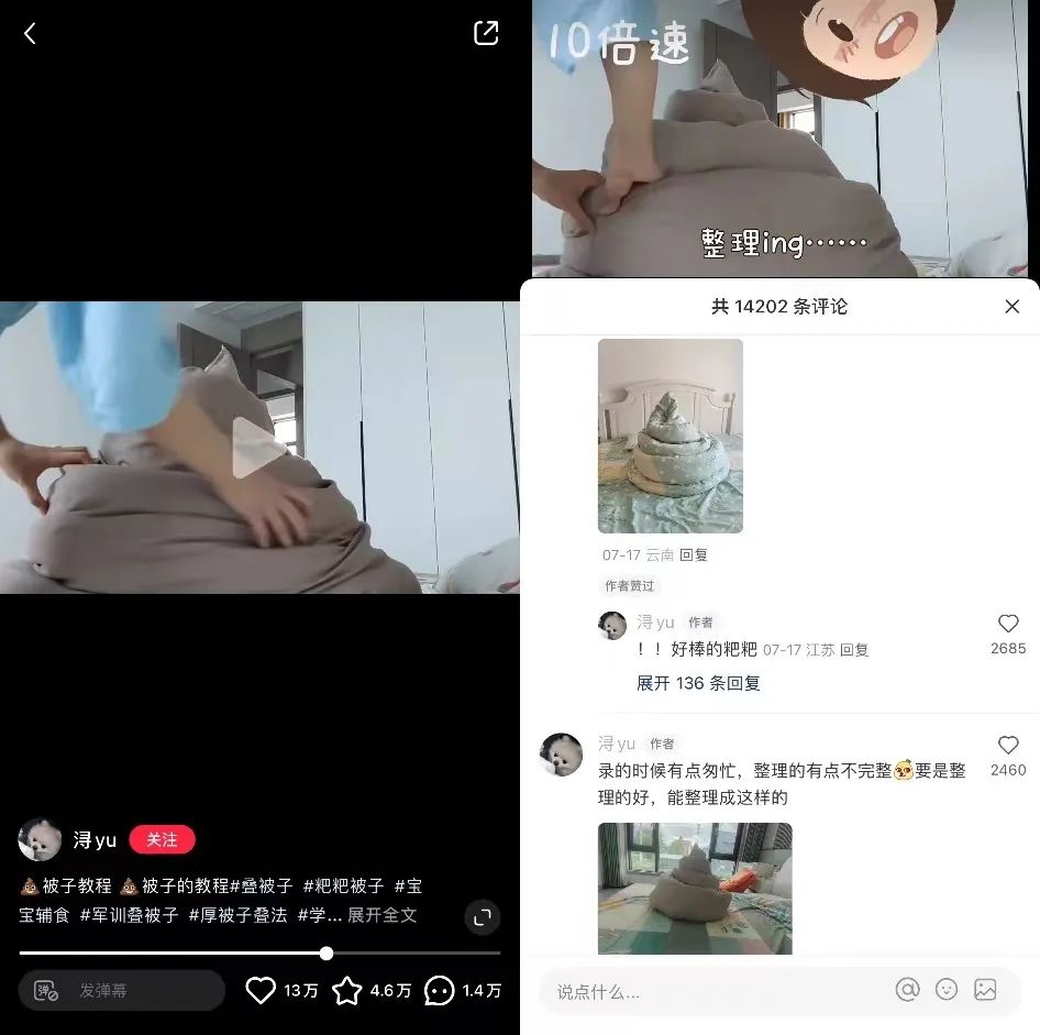 笔记看似有点无厘头,没想到却颇受欢迎,被点赞了超过13万次,吸引了许多网友模仿叠出一个类似形状的被子并晒出自己的作品。
