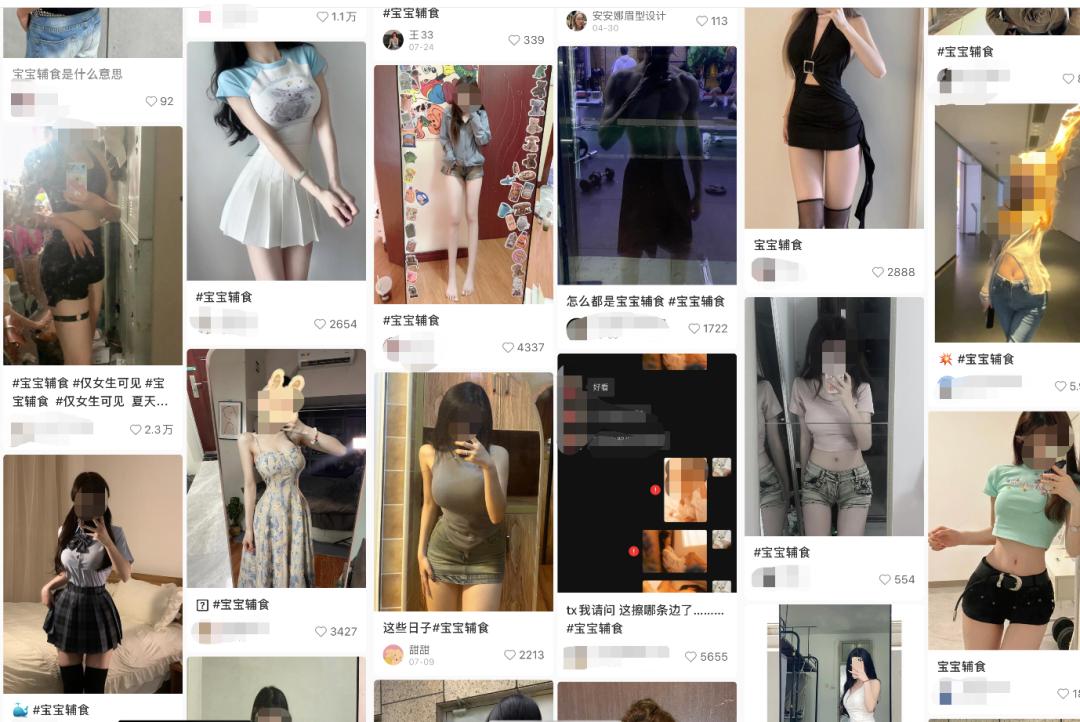 在#宝宝辅食#的话题标签中,不时能刷到一些不露脸、穿着紧身衣秀身材的照片,其中大多是胸大、腰细、腿长的风格,疑似有擦边意味。