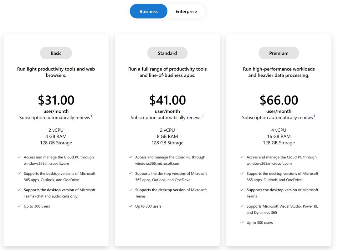 不论是哪个版本,Windows 365 的订阅费都不算便宜,起价便为每位用户每月 31 美元(约人民币 223 元),该价位将提供一个 4GB 的 Azure 虚拟机和 128GB 的存储空间,以及 Microsoft 365 应用程序、Outlook 和 OneDrive。