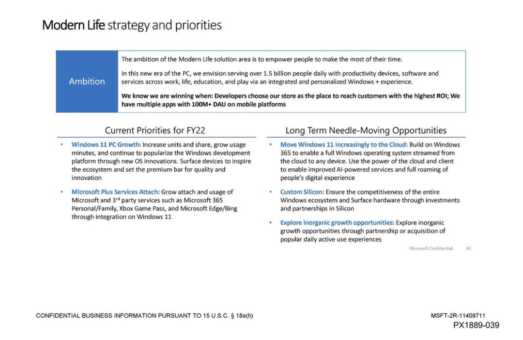 在这份文件中的“现代生活战略和优先级”中,微软将“Windows 11 迁移到云端”的战略视为一个长期机会: