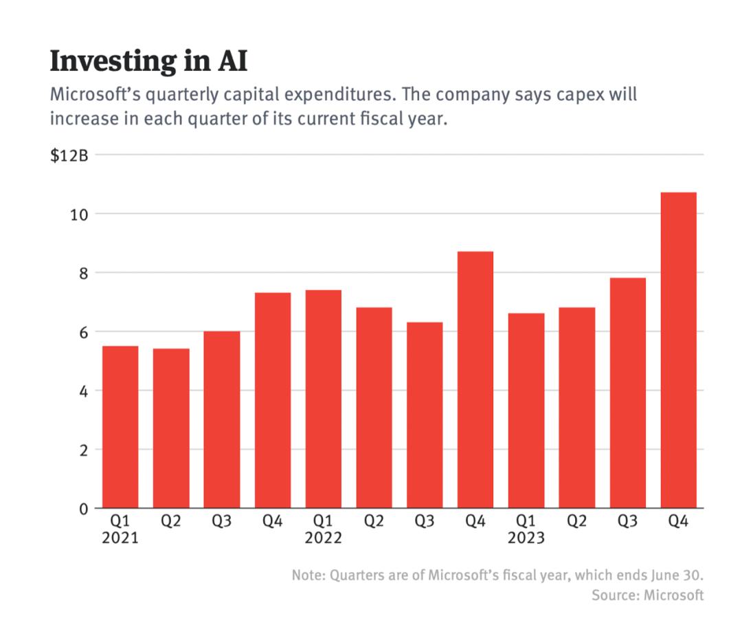微软的资本支出(主要是硬件和软件购买)在第二季度超过了107亿美元,比去年同期增长23%,是公司历史上最高的季度资本支出。首席财务官Amy Hood上周告诉投资者,这个数字在接下来的四个季度中会进一步攀升。(谷歌首席财务官Ruth Porat上周告诉投资者,公司的资本支出将在2023年下半年和2024年增加,主要支出是服务器,包括用于AI。)