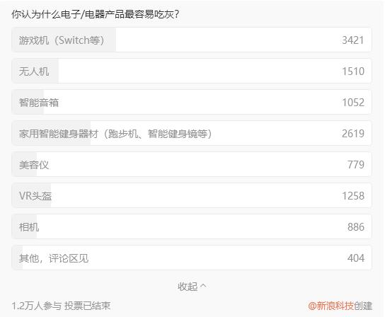 佐证之一便是VR吃灰,在新浪科技5月发起的“你认为什么电子/电器产品最容易吃灰?”的投票中,共有1.2万人参与,其中约10%的人选择了VR头盔,其余高票选项还有Switch、无人机等。