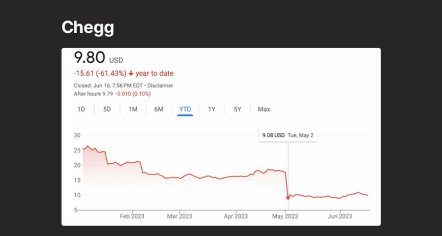 另外一家公司是Chegg。这是一家美国在线教育公司,主要业务是帮孩子解答和辅导作业。这个业务形态很好理解,有些类似我们国内的猿辅导和作业帮。Chegg的CEO在公司Q1的财报电话会议上表示,有越来越多平台上的学生转向ChatGPT问问题,公司收入受到了影响,股价腰斩。这时投资者都预计GPT的影响会越来越大,Chegg这种公司根本没有力量抗衡。