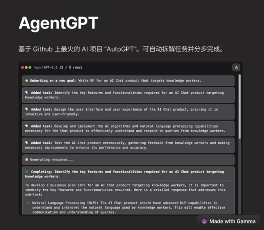 第四个,是目前GitHub上最火的AI项目AutoGPT的AgentGPT。这个产品可以自动拆解输入的问题的目标和任务并逐步完成。比如如果你要求ChatGPT写一个针对知识工作者的AI聊天产品的商业计划书,它会根据自己的理解给你一个BP的文本,包括产品介绍、市场计划、资金需求。但因为它得到的输入很有限,也没有做research,所以只能写出一些非常没有营养的车轱辘话,没有实质性帮助。而AutoGPT拿到这个目标以后,马上就会把它拆解成几个任务,比如如何设计用户交互与用户体验界面以确保对用户友好、开发这个产品需要哪些AI算法和自然语言处理能力,诸如此类。把这些任务拆解出来以后,它会逐个去回答这些问题。执行过程中,又会不断的去发现和提出新的任务,直到最终把任务拆解执行完。