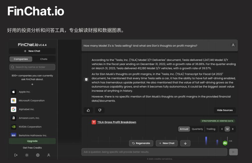 第一个是公司财务数据助手Finchat.io。很多业余投资者想要读懂公司数据,但没有时间或者没有专业能力研读公司财报等信息,这个产品可以帮到你。