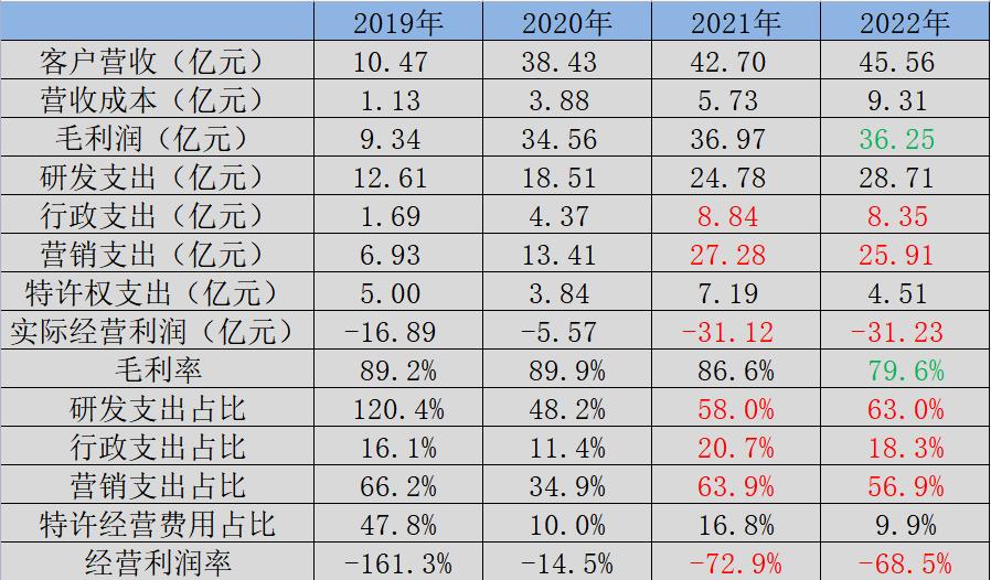 最直接的体现是在2022年财报中,虽然信达生物营收同比增长2.86亿元至45.56亿元,但毛利润反而却有所降低,再加上研发、行政、营销费用的巨额支出并没有下降,因此公司实际经营亏损不仅没有因为规模提升而缩窄,甚至数额还小比例的扩大。