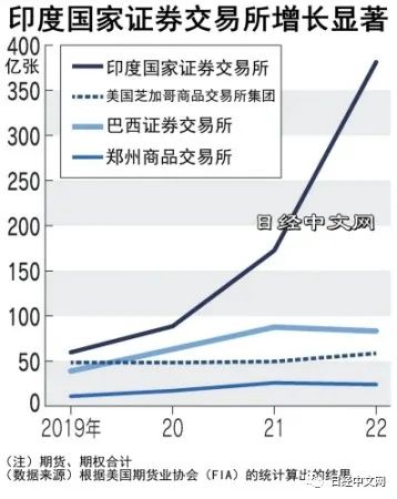 根据美国期货业协会(FIA)的统计的结果显示,在全球各大金融衍生品交易所中,存在感提升迅速的是印度的交易所。印度国家证券交易所(NSE)的期货和期权合计交易量截至2022年已连续4年位居世界第一。股指相关交易,尤其是期权交易成为拉动交易量增长的重要因素,2022年创下381亿手的纪录,远远超过排在第2位的巴西证券交易所B3(83亿手)。
