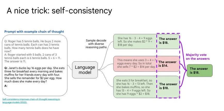 第二个想法是「自我一致性」(Self-Consistency):对多次生成进行采样调查,然后选择最常见的答案。「自我一致性」改善了语言模型中的思维链推理。