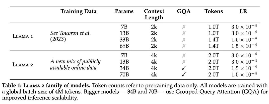 在预训练层面,Llama 2 模型系列以 Llama 1 论文中描述的预训练方法为基础,使用了优化的自回归 transformer,并做了一些改变以提升性能。相比于 Llama 1,Llama 2 的训练数据多了 40%,上下文长度也翻倍,并采用了分组查询注意力机制。具体来说,Llama 2 预训练模型是在 2 万亿的 token 上训练的,精调 Chat 模型是在 100 万人类标记数据上训练的。