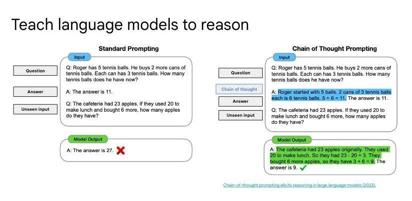 随后,Jason 介绍了他和其他人在 LLM 推理能力上所做的研究工作。首先是思维链(Chain-of-Thought)。如果你用一个想法来提示 LLM,它给出的回复质量就会飞跃。