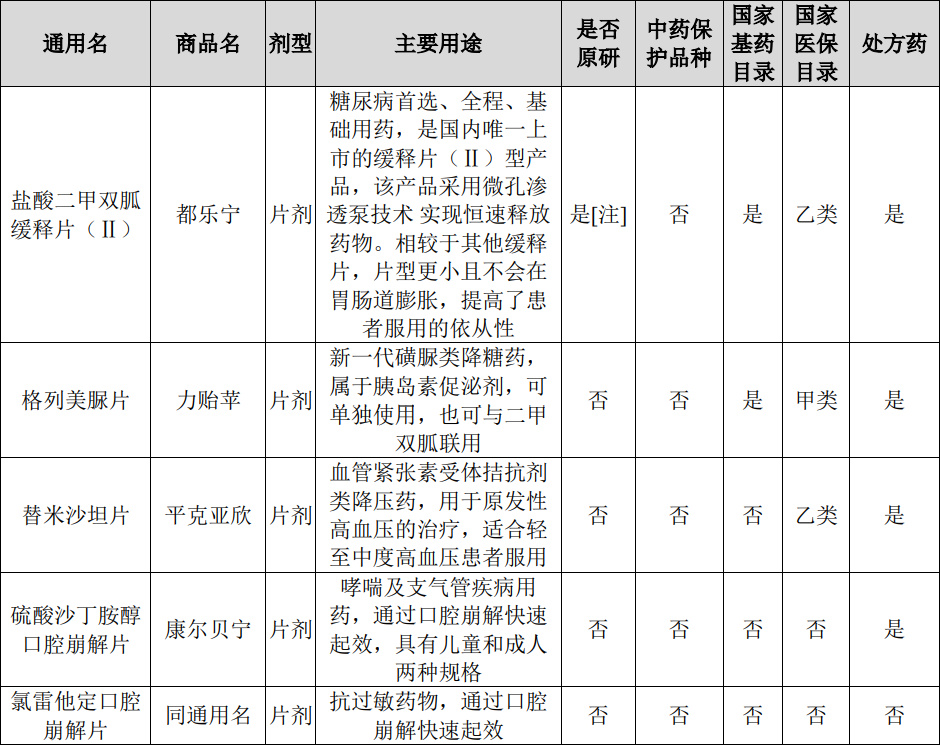 产品主要包括盐酸二甲双胍缓释片(Ⅱ)(商品名:都乐宁)、格列美脲片(商品名:力贻苹)、那格列奈胶囊、格列齐特胶囊、格列吡嗪口腔崩解片。