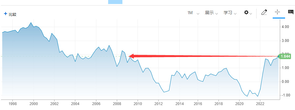 30年期实际收益率上次突破2%还要追溯2011年。此后,随着美联储大幅降息和对通胀保值的需求飙升,这一收益率在2020年和2021年曾跌至-0.50%左右。
