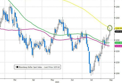 技术图表显示,彭博美元指数在隔夜盘中一度升穿了200日均线。正回报的吸引力正推动资金回流美元,美元自上月创下的逾一年低位已反弹约3%。