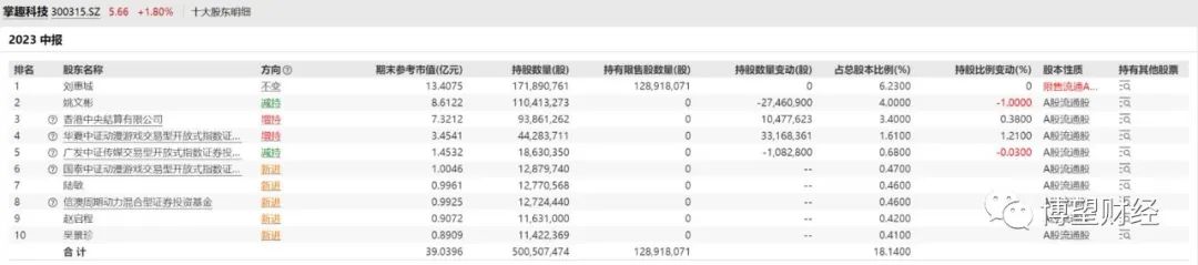 对比2022年底掌趣科技前十大股东明细,彼时腾讯、姚文彬分别持股3.97%、5.02%,短短半年时间腾讯减持到已不再是其前十股东,很可能是清仓,按照目前股价估计,腾讯至少套现6.2亿元。
