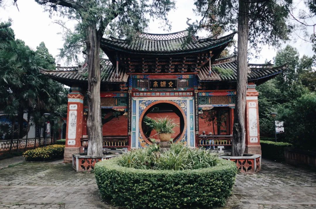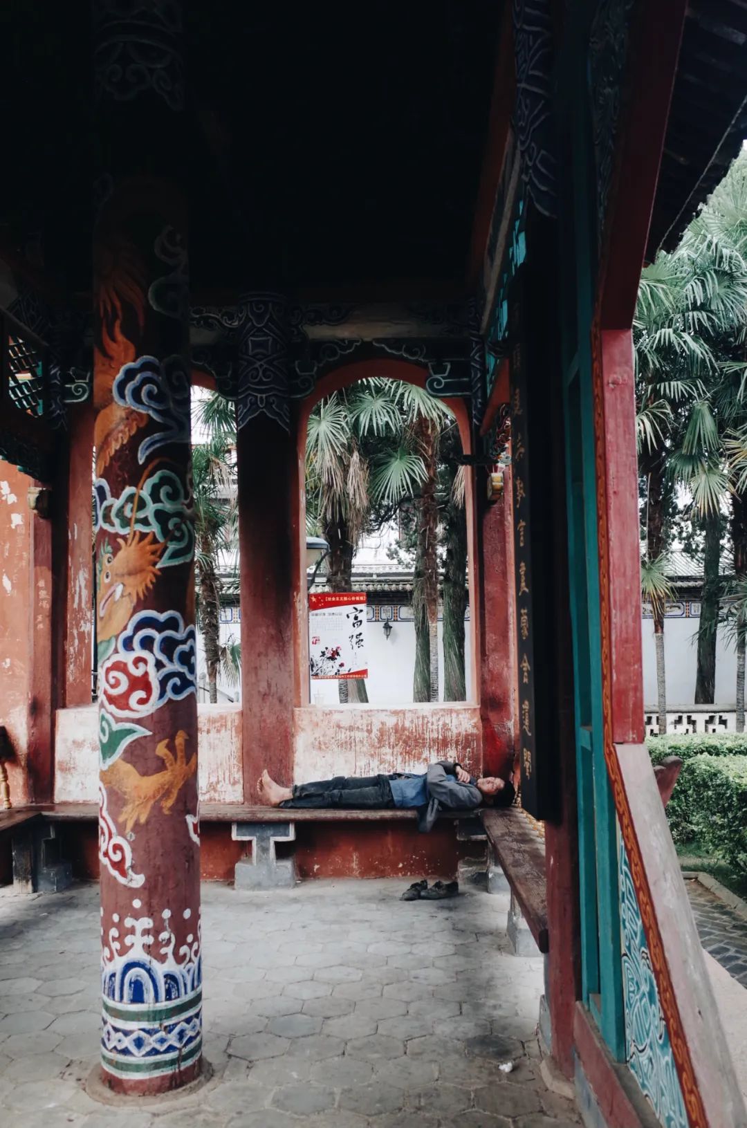 巍山古城内还留有几处大型书院、文庙及寺庙,其中的等觉寺正是典型的明代式样。我与朋友碰巧走入了蒙阳公园,这里一边是现代公园的模样,一边是古代园林式的传统空间。夕阳西下,当霞光照在古亭上,虽没有江南水乡那般婉约、似水柔情,却也不失美意。