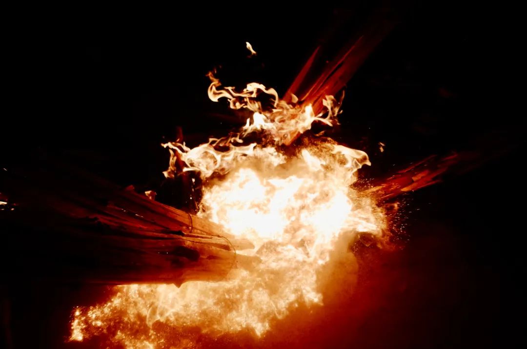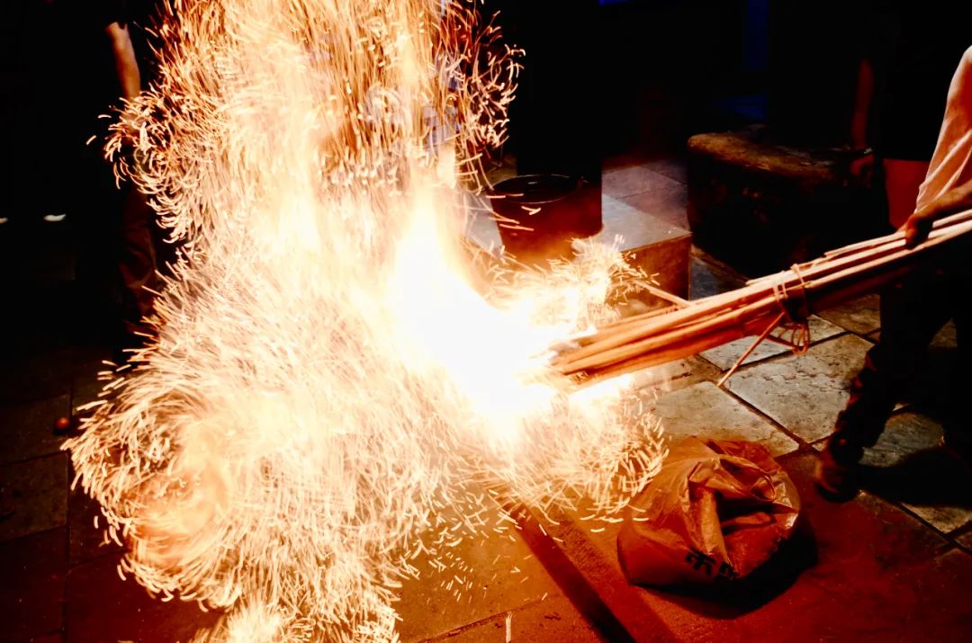 越靠近火把,越能感受火光扑面,热气像浪一样袭来。我们一路挤过人群,身后的烟花绽放,如长枪刺破夜空。