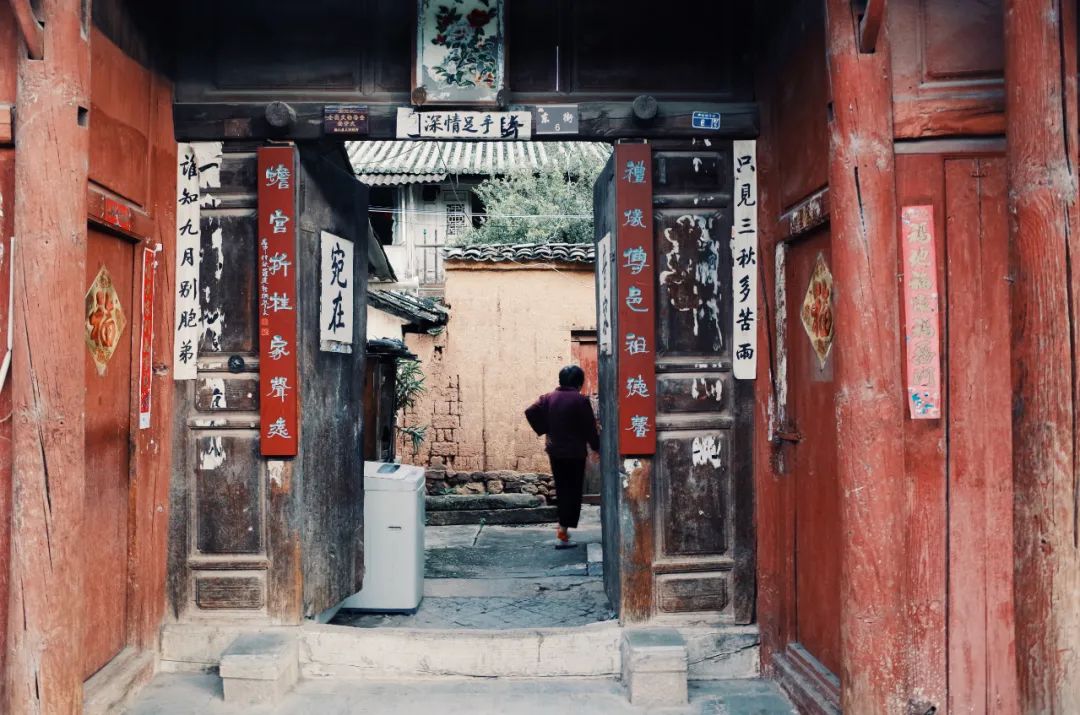 巍山古城的古意,还落在转角处等每个不起眼的地方。一户人家门上的挽联吸引了我的注意,这样笔法老练、运笔工整的书法,一看就是功底深厚之人所写。其上联写着“谁知九月别胞弟”,下联是“只见三秋多苦雨”,横批“手足情深”。这还不够,木门正中间还要贴一副“音容宛在”,才足以表达对亡者的悼念之情。