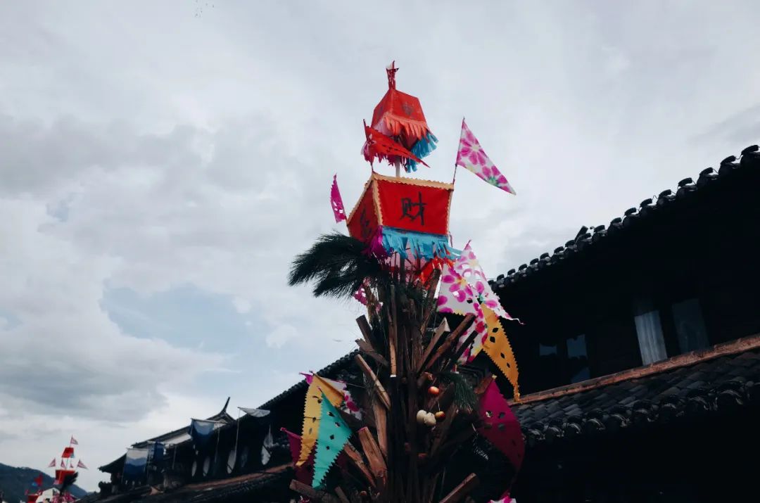 在大理的村子里,当年有孩子出生的人家,都要竖起一个大火把。人们会用山上砍来的松树,捆上麦秆、松枝等,制作成火把的杆;火把顶上是三个用竹竿串联起的纸升斗,寓意“连升三级”。