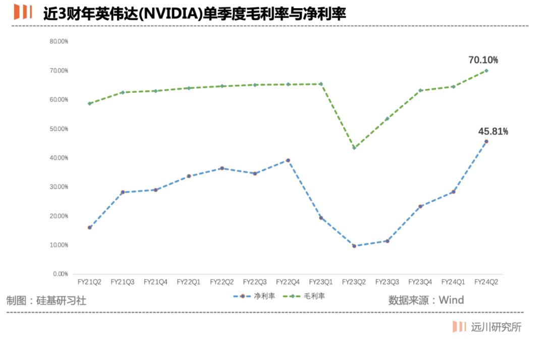 在本轮AI热潮之前,英伟达的毛利率常年维持在65%上下,而净利率通常只有30%。而今年Q2受高毛利的A100/A800/H100的拉动,毛利率站上70%,净利率更是高达45.81%。