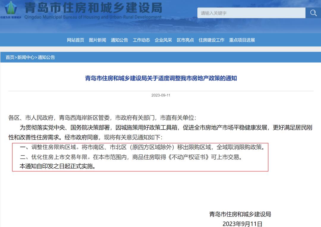 9月11日,青岛市住建局发布《关于适度调整我市房地产政策的通知》,提出了两条措施: