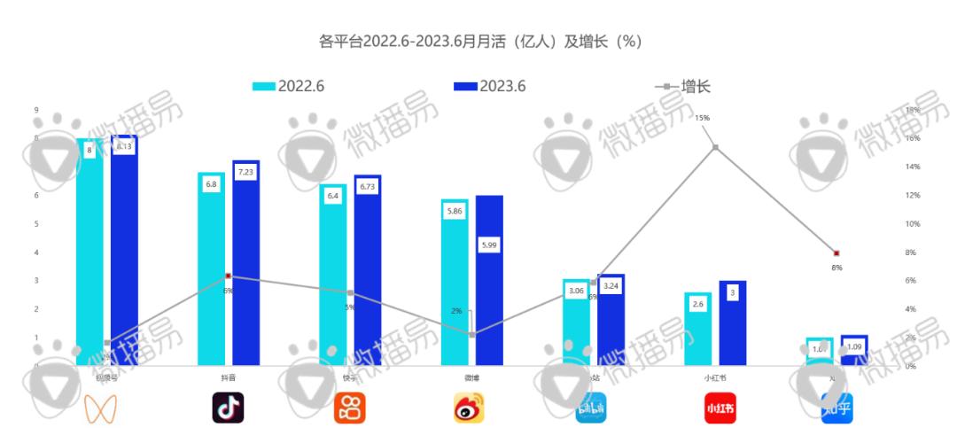 从用户体量上讲,视频号(超8亿月活)、抖音(超7亿月活)用户体量最大,此外,从增长角度,小红书(月活增长15%)、知乎(月活增长8%)平台增速较快。