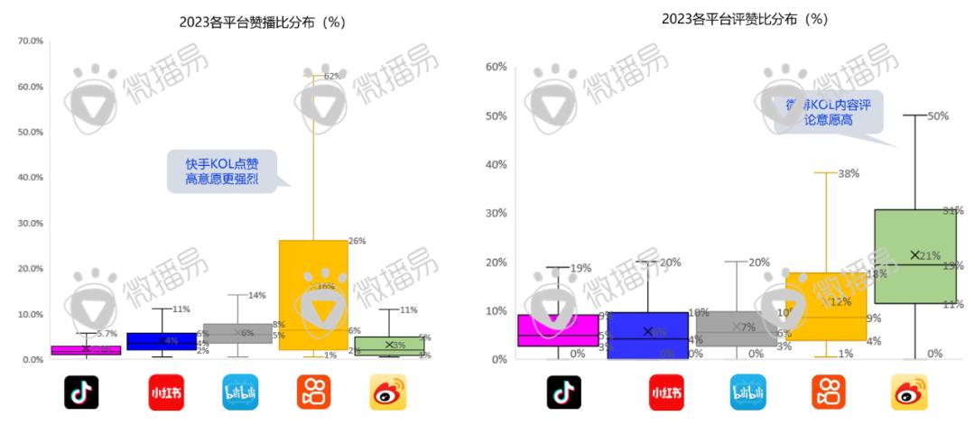 从互动优势角度,B站、小红书的互动率最高,另外,赞播比与评赞比也可用来衡量用户的互动意愿,快手整体赞播比跨度最大且综合表现最好,微博在评赞比方面更具优势。