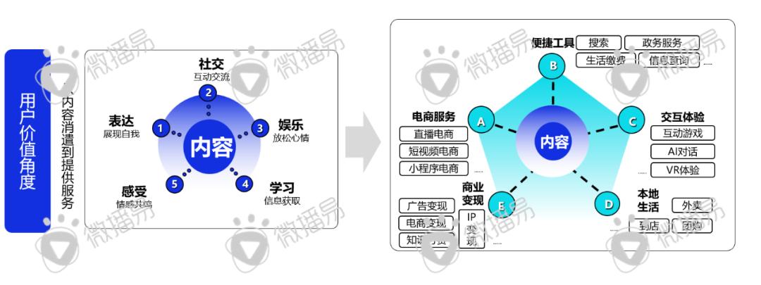 抖音、快手、b站、小红书、微信等短视频/社交媒体平台已经不再仅仅是内容平台,而是能为用户提供综合服务的平台,各平台以内容原点,升级成为能够向用户提供电商服务的“新货架”、提供便携工具的“新入口”、提供交互体验的“新玩法”、提供本地生活服务的“新渠道”、提供商业变现的“新来源”,可以说各平台业务版图是“有中心、无边界”
