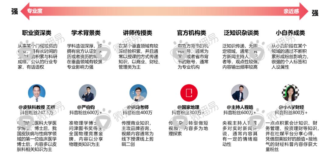 微播易总结发现从分类,KOP的种类并不单一,职业资深、学术背景、讲师类、官方、泛知识杂谈、小白养车类,优势各不相同