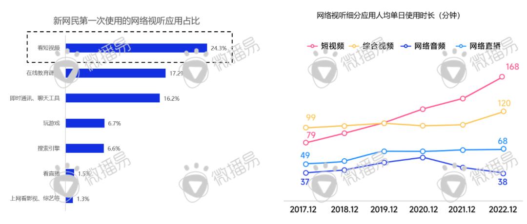 除了用户规模与市场规模的不断“横向”扩张,短视频在时间“纵深”上的优势也愈加明显,短视频单日人均使用时长已遥遥领先综合视频、网络音频与网络直播等传统媒介成为新的“杀时神器”,截止2022年年末,人均每天“沉浸”短视频约3小时。
