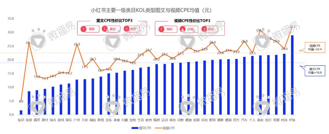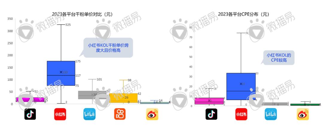 从单位成本角度出发,微博和抖音千粉单价和CPE都较为便宜,此外,由于小红书聚集高净值女性,品牌投放客单相对较高,单位投放成本也偏高;此外,小红书作为强消费决策型平台,用户和品牌都较为认可其种草价值,但与此同时,由于小红书达人多以中长尾达人以及野生达人(没有签约MCN机构的达人)为主,小红书KOL的千粉单价和CPE都比较高且跨度较大,目前还没有形成集体标准与规则。