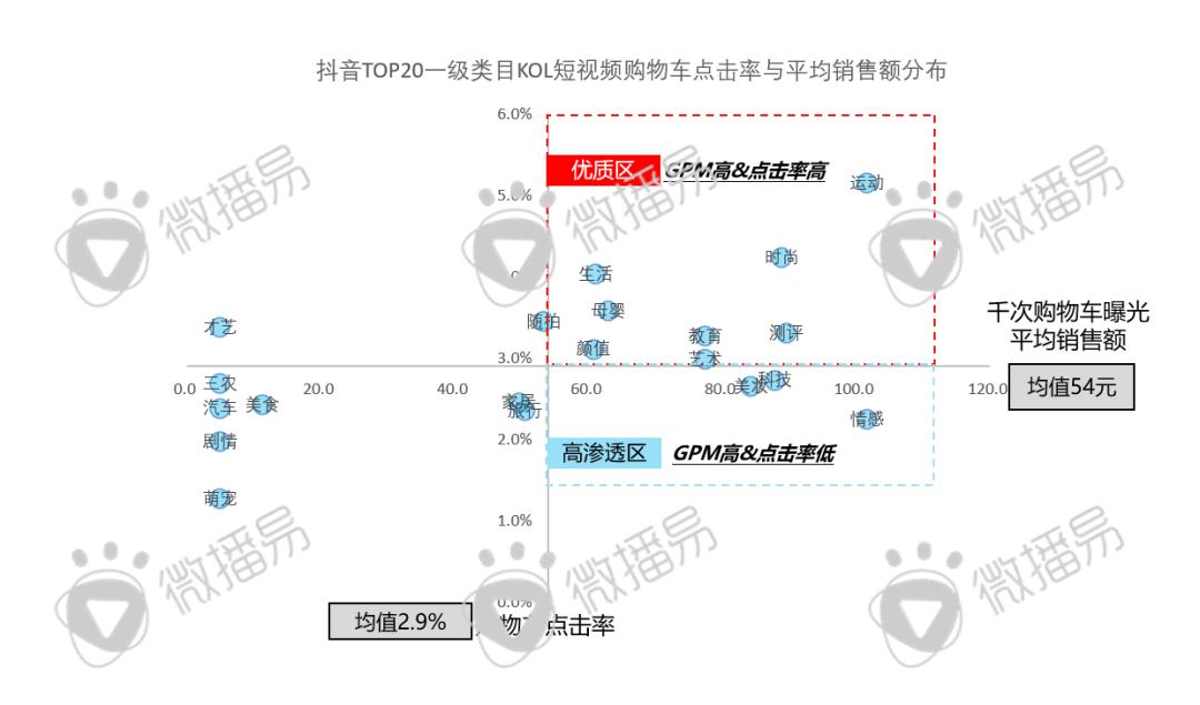 另外,从带货达人类型上,抖音泛生活类达人带货能力“非同一般”,运动/时尚类KOL综合带货能力较强,仅从种草导购能力即购物车点击率方面,除了运动与时尚类账号,生活、母婴、随拍数据优异。