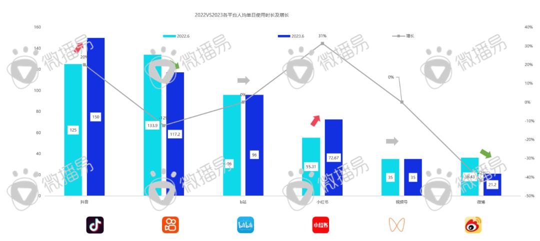 从用户的使用粘性体量上,抖快平台用户日均使用时长超2H,小红书用户粘性激增(人均单日使用时长增长31%)