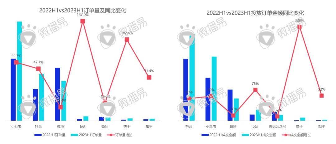 从客户投放角度,抖音最吸金,2023上半年消耗的客户预算最多,此外,小红书商业化浓度最高,客户的投放订单量级最多,B站达人商业化体量增长最明显。